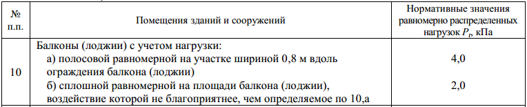Согласно главе 8.2 СП 20.13330.2011 "Нагрузки и воздействия" (аналогично - СНиП 2.07.01-85), нагрузку на балконы и лоджии следует принимать по одному из двух подпунктов пункта 10 таблицы 8.3.